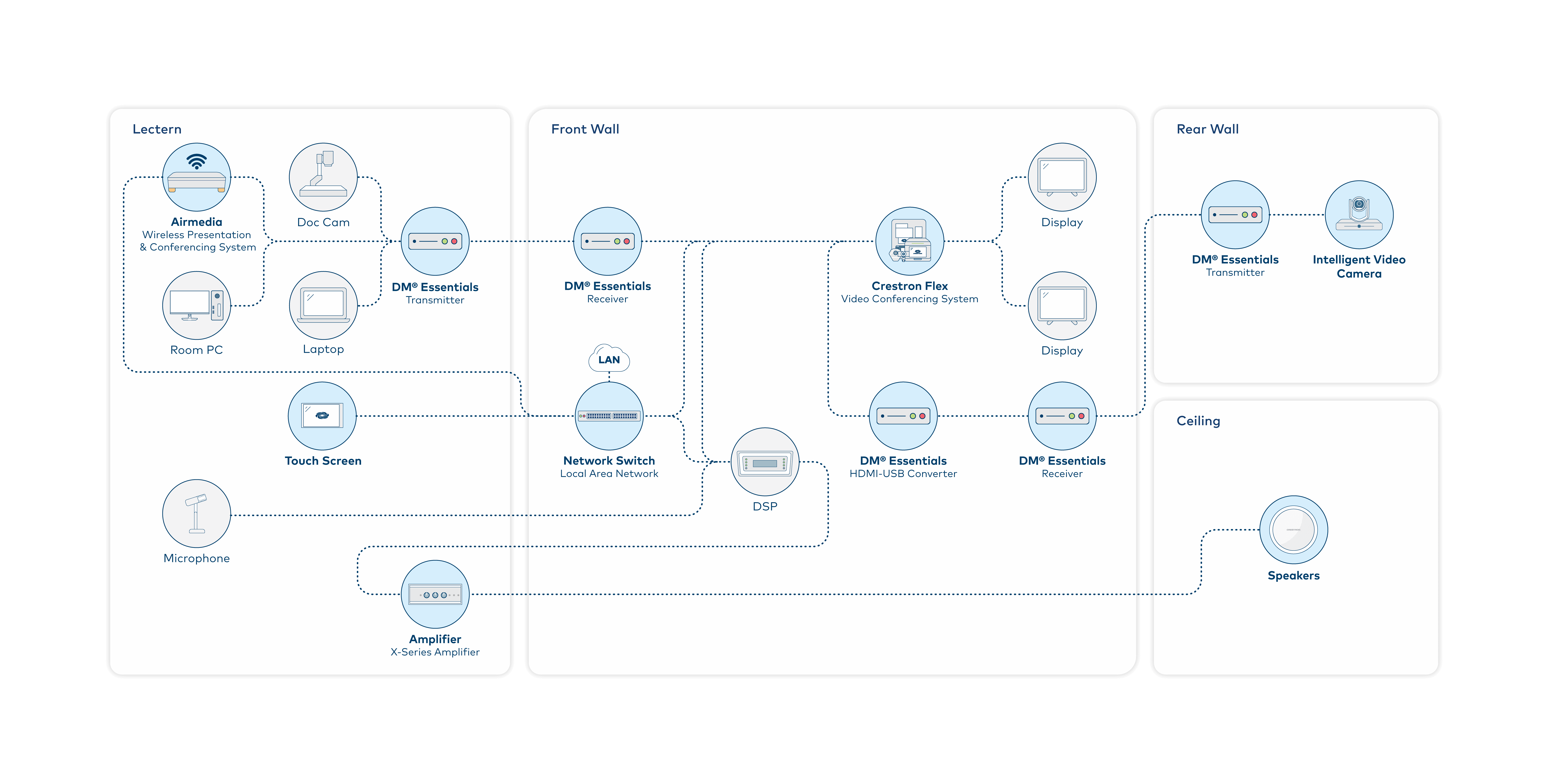 A hybrid or hyflex classroom is a learning environment capable of in-class and simultaneous online learning using software-based video conferencing like Zoom® or Microsoft Teams® software, and more. The instructor shares content from a laptop, room PC, or wirelessly from a source to the displays for a more engaging in-room or remote experience.